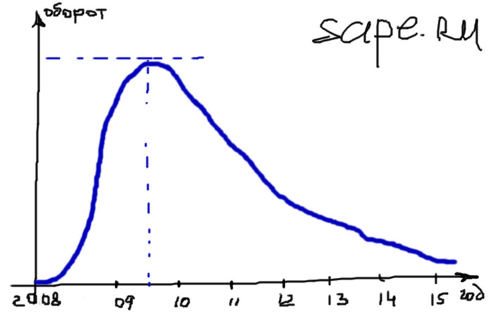 Я начал зарабатывать на ссылках в 2008-ом году. В этом году появилась всем известная «Хитрая кантора» и можно было клепать всякое унылое говно, прокачивать пузомерки, запихивать в биржу и попивать хороший виски с друзьями, обзывая тех, кто ходит на работу лохами и горделиво думая про себя: как хорошо, что я не прогнулся под систему. Но к середине 2009-го года этот вид заработка достиг своего пика и с тех пор плавно идет на убыль. Вот, я нарисовал примерный график денежного оборота этой биржи на основании своих ощущений. Думаю, я не сильно ошибся.
